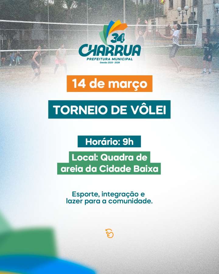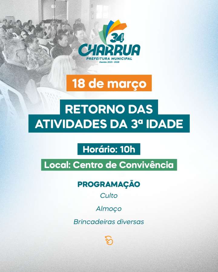 No dia 18 de março, duas atividades marcam a data. Pela manhã, às 10h, ocorre o retorno das atividades da 3ª idade, no Centro de Convivência, com programação que inclui culto, almoço e atividades recreativas. À noite, às 20h, acontece a Taça 34 Anos de Charrua, no Ginásio Poliesportivo Municipal, com jogos nas categorias veteranos, feminino e livre masculino.