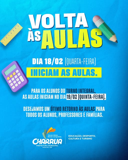 A Prefeitura de Charrua, por meio da Secretaria de Educação, Desporto, Cultura e Turismo, informou que o início do ano letivo na rede municipal está marcado para o dia 18 de fevereiro (quarta-feira).