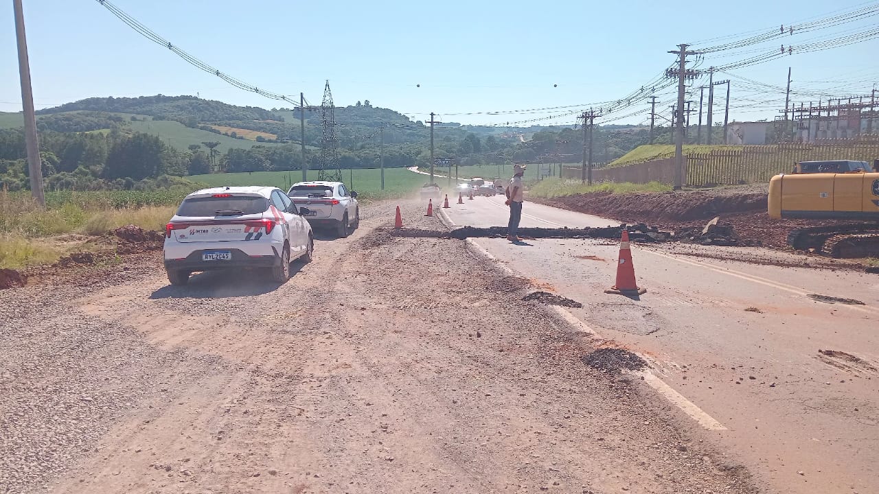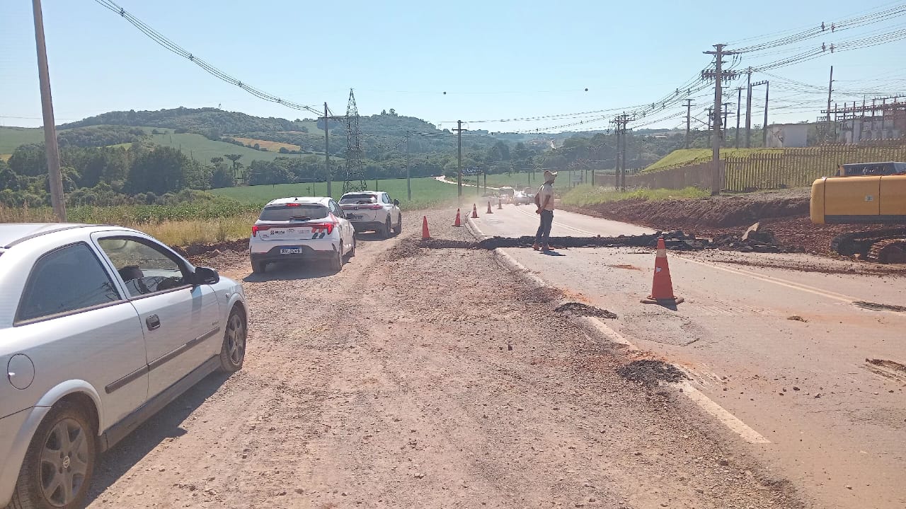 Em função dos trabalhos, o trânsito está sendo desviado junto ao trecho asfaltado. As intervenções fazem parte da construção do trevo de acesso à unidade da Aurora Coop — obra que já vinha ocasionando alterações estruturais na pista e ajustes na circulação viária.