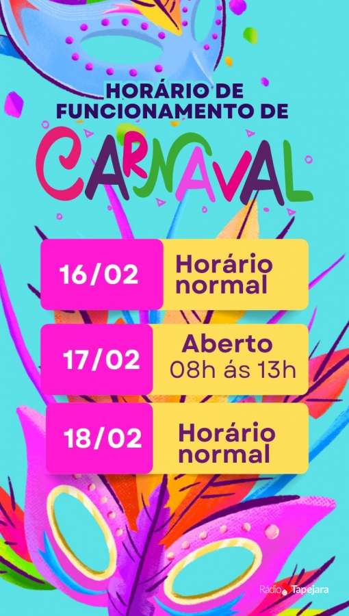 A Lotérica Tapejara estará atendendo neste sábado (14), pela parte da manhã, na segunda-feira (16) fará o horário normal, na Terça de Carnaval (17) atendimento das 08h às 13h e na Quarta de Cinzas em horário normal.