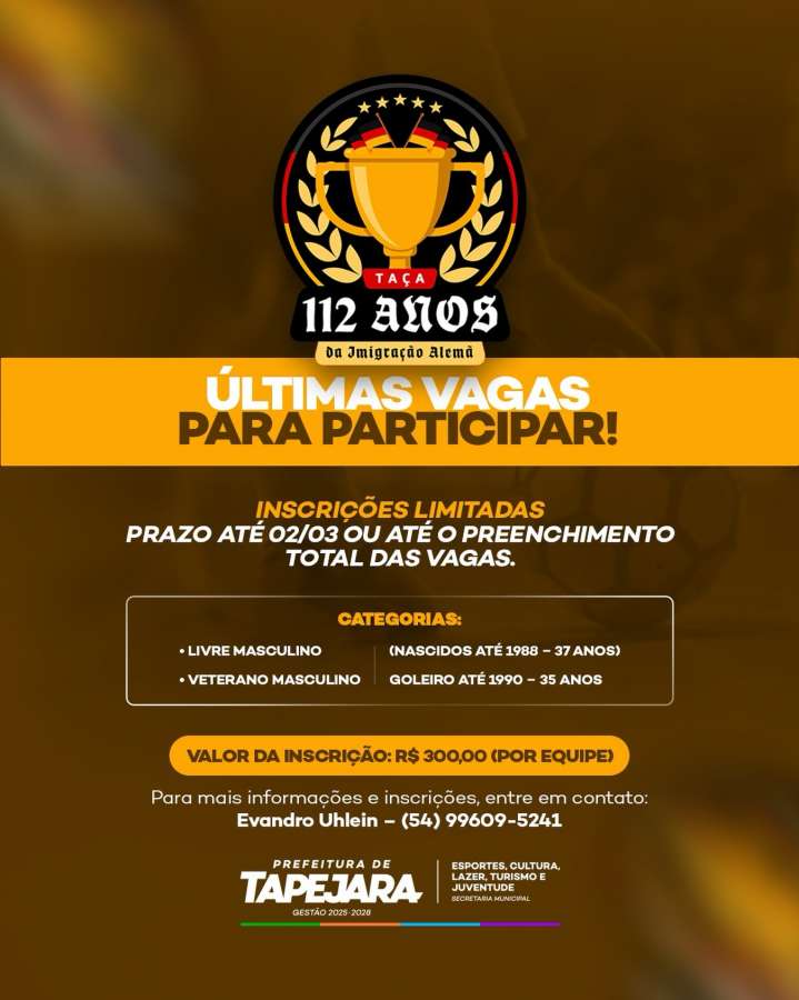 Estão abertas as inscrições para a Taça 112 Anos da Imigração Alemã. As equipes interessadas podem se inscrever até o dia 2 de março ou até o preenchimento total das vagas na Secretária de Esportes de Tapejara situada junto a Biblioteca Pública Municipal