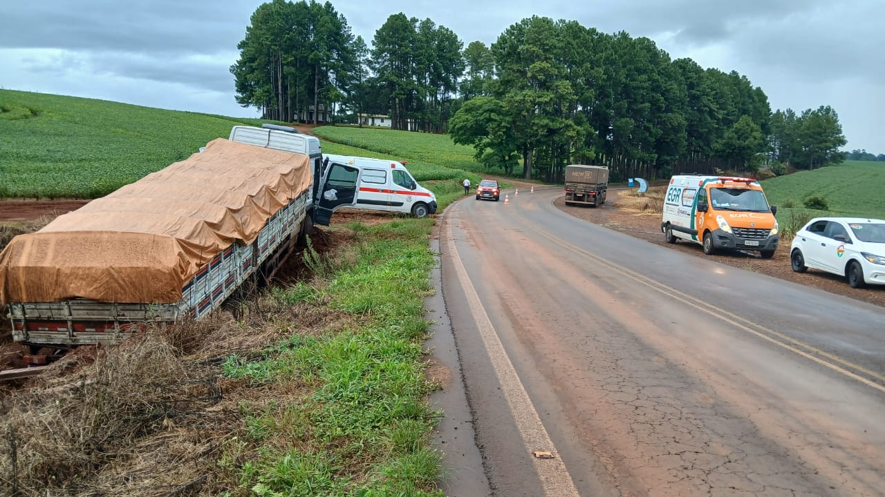 De acordo com as informações, um caminhão equipado com carroceria graneleira seguia em direção a Coxilha quando o condutor perdeu o controle e saiu da pista. O utilitário caiu em uma valeta na margem oposta da rodovia.