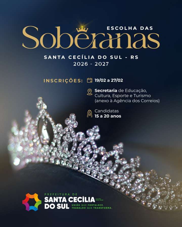 A Prefeitura Municipal de Santa Cecília do Sul está com inscrições abertas para a Escolha das Soberanas 2026/2027, evento que valoriza a cultura local e elege as representantes oficiais do município em atividades e eventos comunitários.