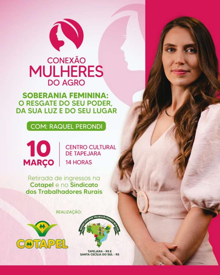 O encontro será às 14h, no Centro Cultural de Tapejara, e contará com a palestra de Raquel Perondi, que abordará o tema “Soberania Feminina: o resgate do seu poder, da sua luz e do seu lugar.”