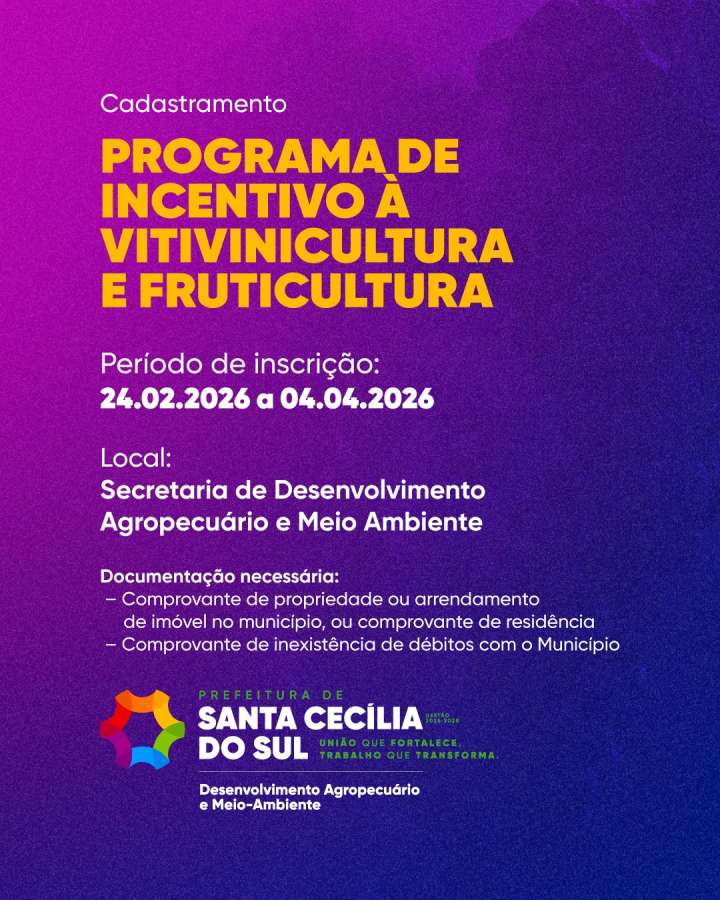 A Prefeitura de Santa Cecília do Sul está com inscrições abertas para o Programa de Incentivo à Vitivinicultura e Fruticultura. A iniciativa busca fortalecer os produtores locais e estimular o desenvolvimento das atividades agrícolas no município.