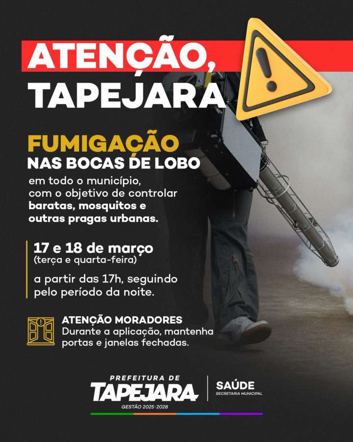 A Prefeitura de Tapejara, por meio da Secretaria Municipal de Saúde, realizará nos dias 17 e 18 de março uma ação de fumigação nas bocas de lobo em todo o município de Tapejara.