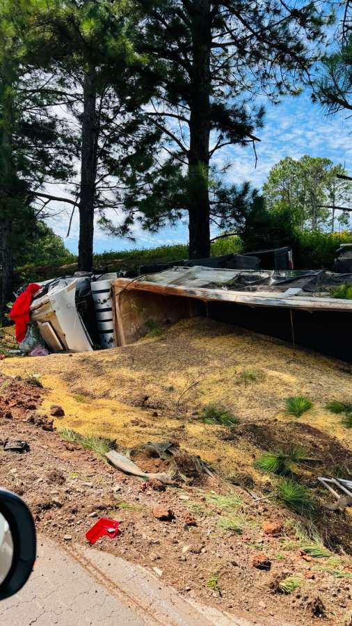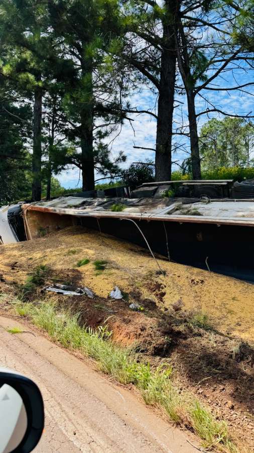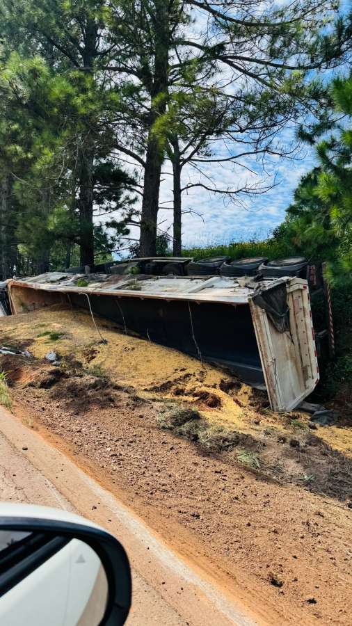 Um caminhão carregado de soja tombou na manhã desta segunda-feira, dia 16, na rodovia RS-463, no município de Coxilha.