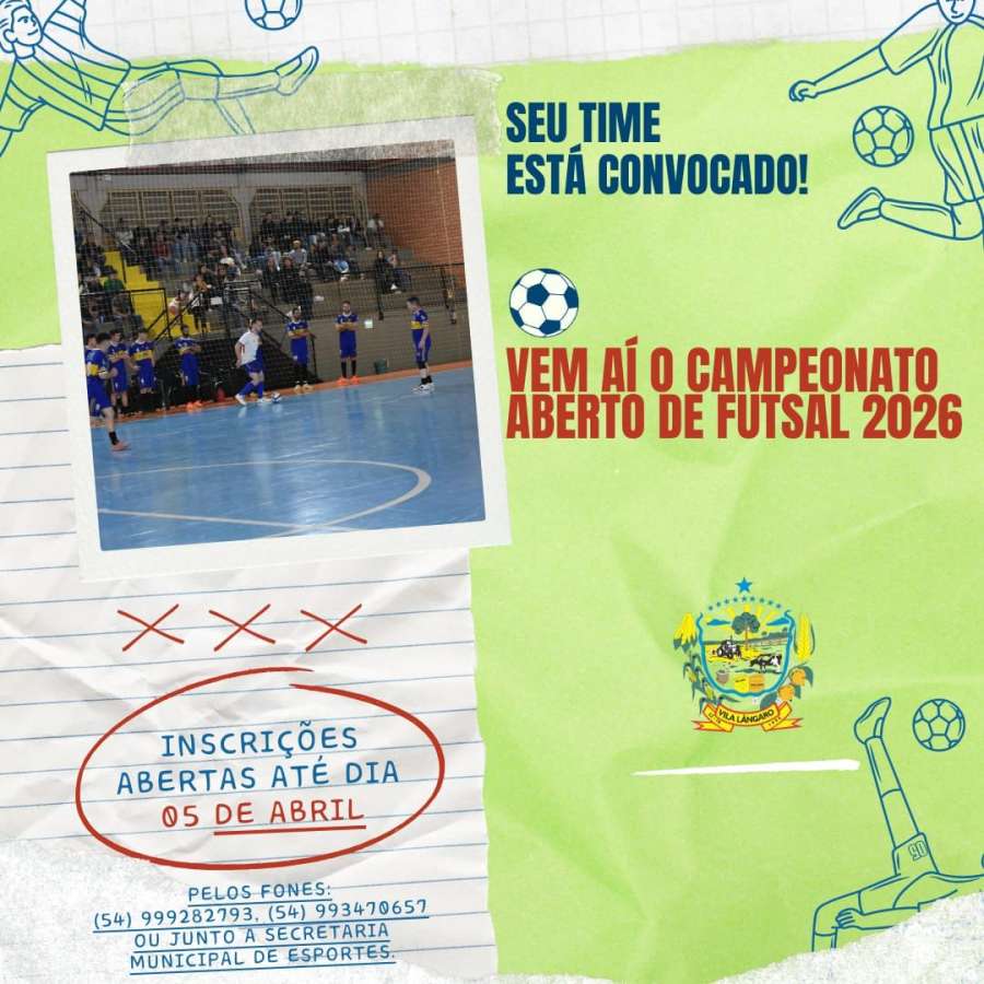 A Administração Municipal de Vila Lângaro, por meio da Secretaria de Esportes, está com inscrições abertas para o Campeonato Aberto de Futsal 2026. As equipes interessadas podem se inscrever até o dia 5 de abril.