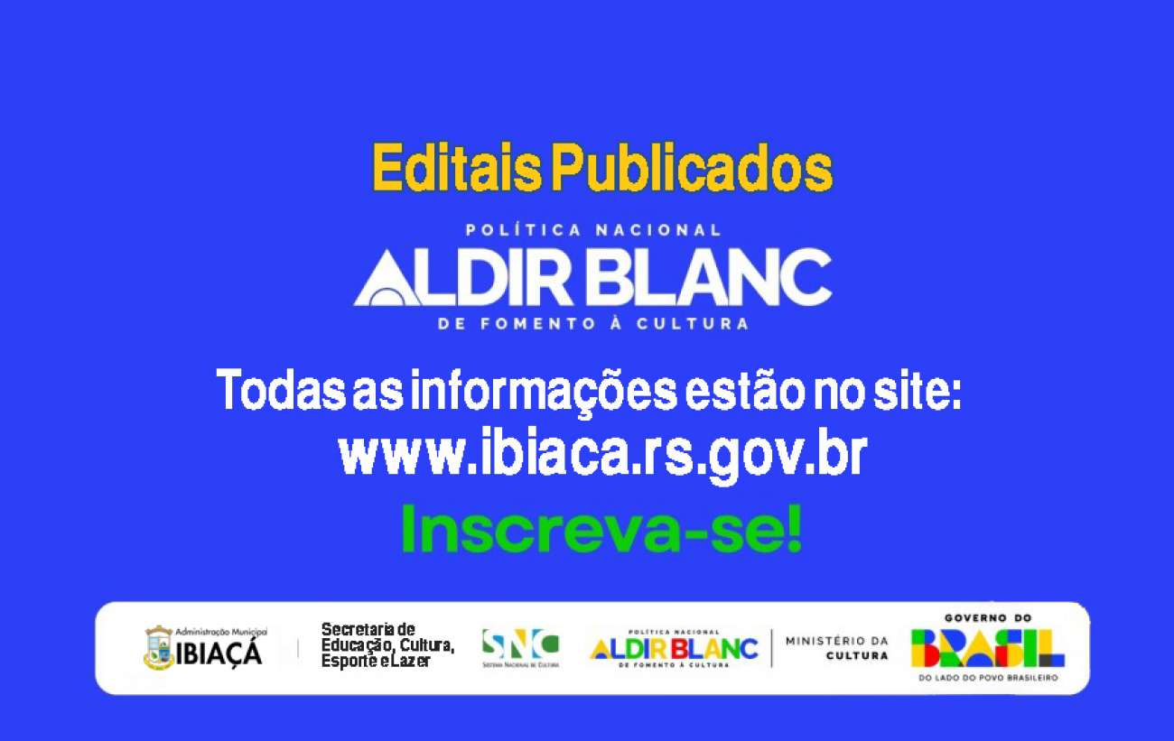 A Prefeitura de Ibiaçá divulgou os editais da Política Nacional Aldir Blanc de Fomento à Cultura (PNAB), iniciativa do Ministério da Cultura que visa fortalecer e incentivar as atividades culturais em todo o país.