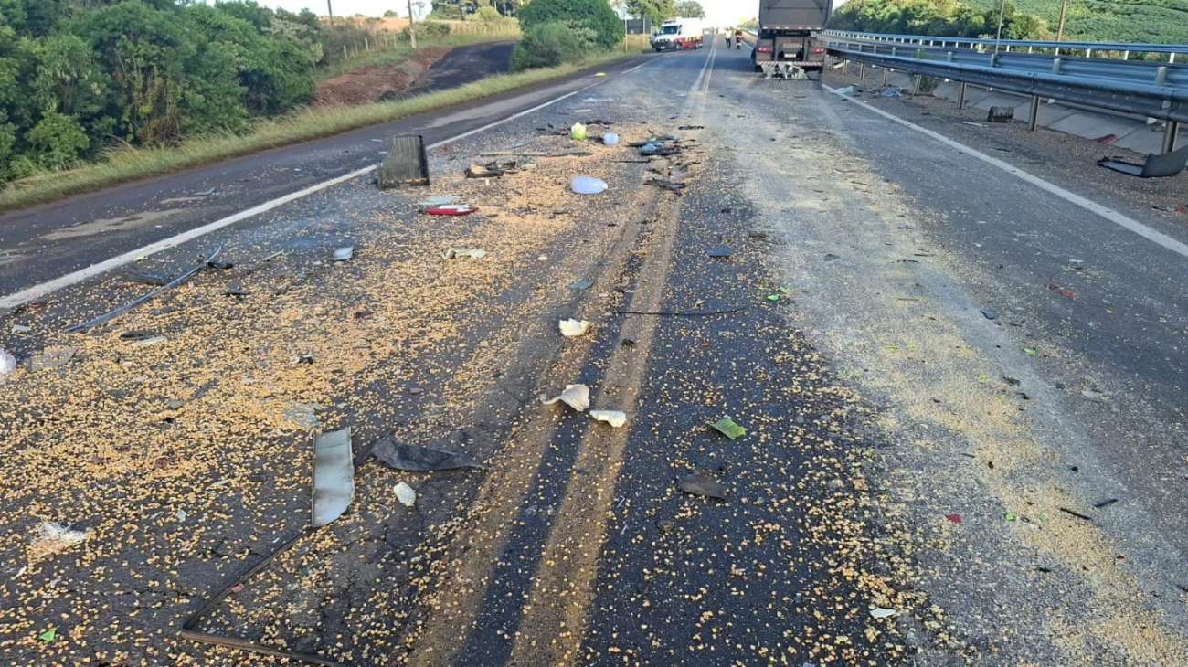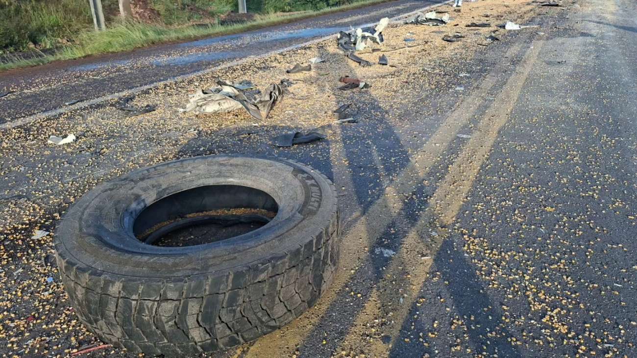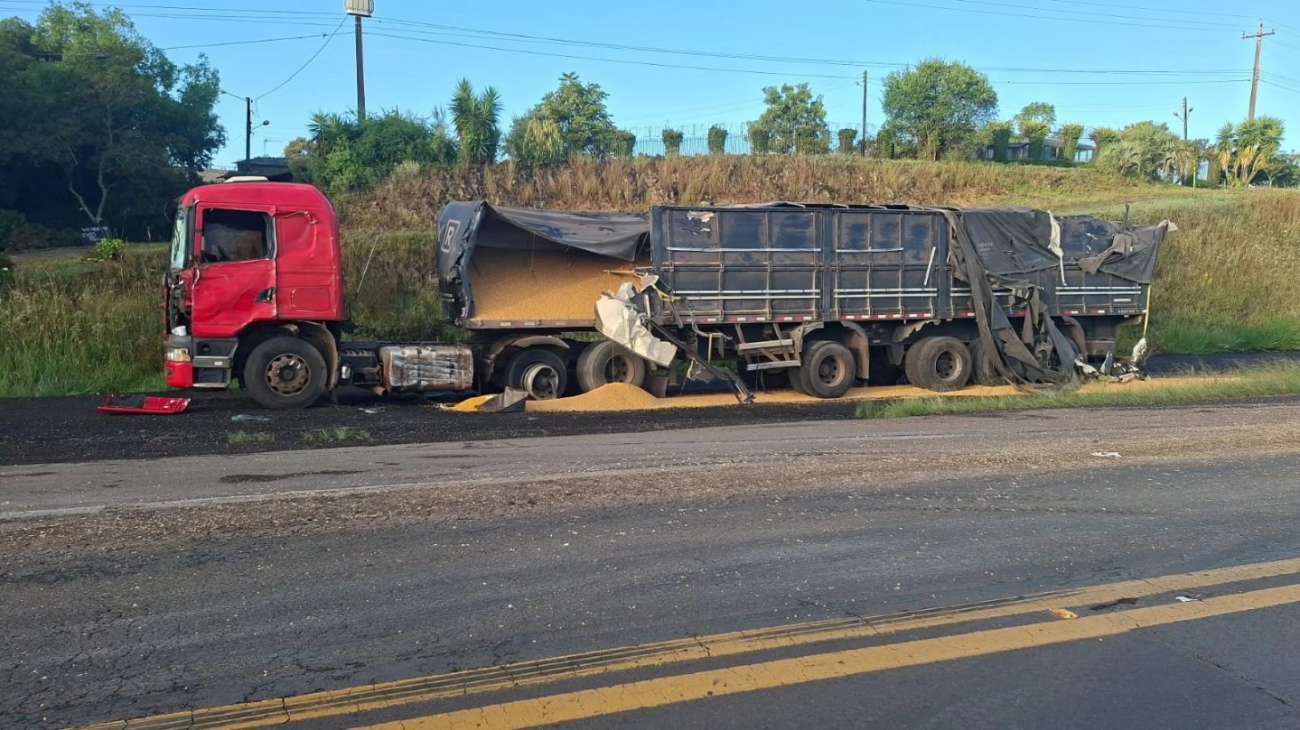 A colisão envolveu duas carretas, sendo uma com placas de Maracajá e outra de São Borja. Com a força do impacto, o condutor de um dos veículos não resistiu aos ferimentos e morreu ainda no local.