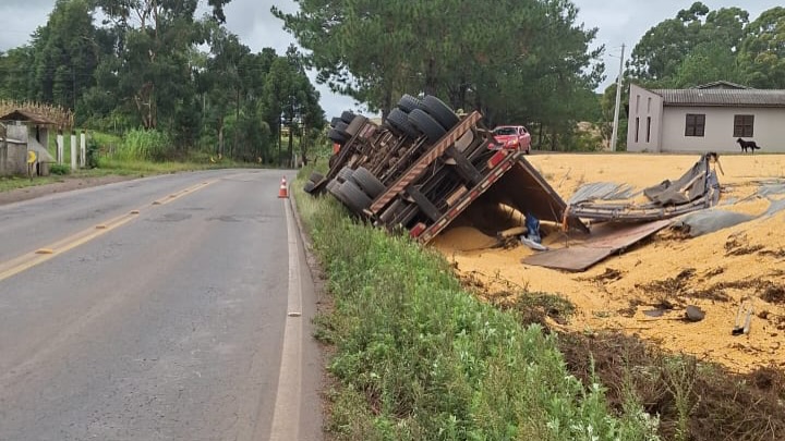 Conforme informações repassadas pelo Comando Rodoviário da Brigada Militar, um caminhão acoplado a um semirreboque acabou tombando, deixando a carga espalhada às margens da rodovia. O veículo ficou fora da pista.