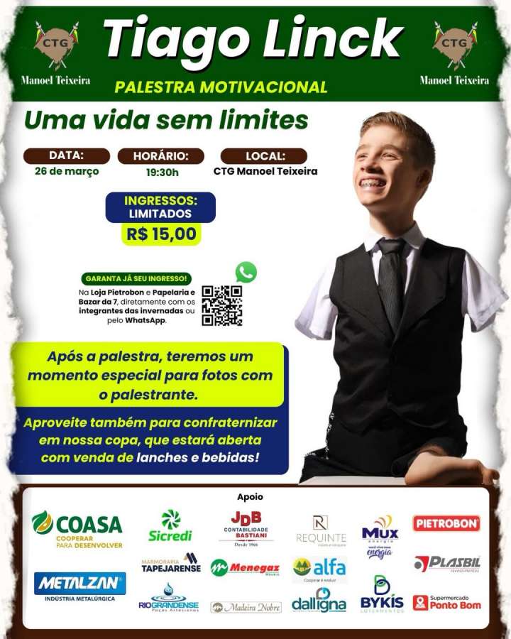 O palestrante Tiago Link trará para Tapejara um encontro motivacional. O evento está marcado para a noite de hoje (26 de março), às 19h30, no CTG Manoel Teixeira, em Tapejara. O encontro propõe reflexões sobre desafios pessoais e desenvolvimento individual.