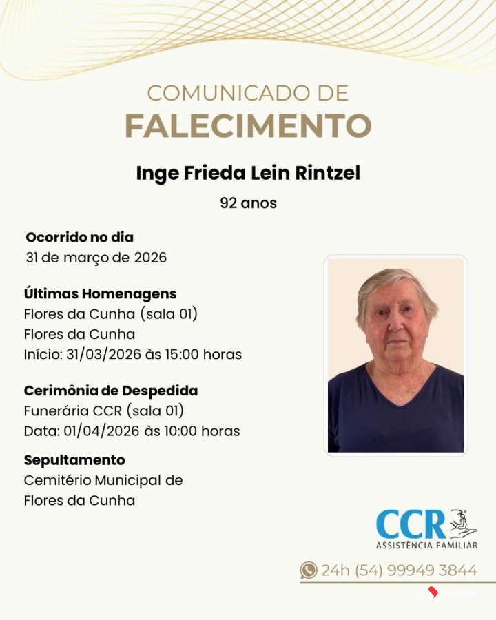 Faleceu Inge Frieda Leni Rintzel mais conhecida por Inha - mãe da Neli do velho Casarão , ocorrido na tarde desta terça Feira em Flores da Cunha com 92 anos. Está sendo velada na Capela 1 da Funerária CCR Flores da Cunha. Cerimônia de despedida nesta quarta-feira (01) às 10:00h no local do velório e logo após seu sepultamento no cemitério municipal de Flores da Cunha.