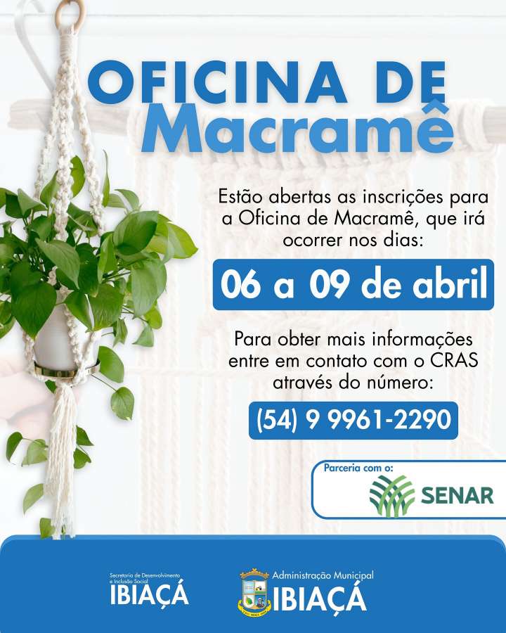 As aulas serão realizadas entre os dias 6 e 9 de abril, no CRAS de Ibiaçá, oferecendo aos participantes a oportunidade de aprender técnicas de macramê, estimular a criatividade e desenvolver novas habilidades que podem, inclusive, gerar renda.