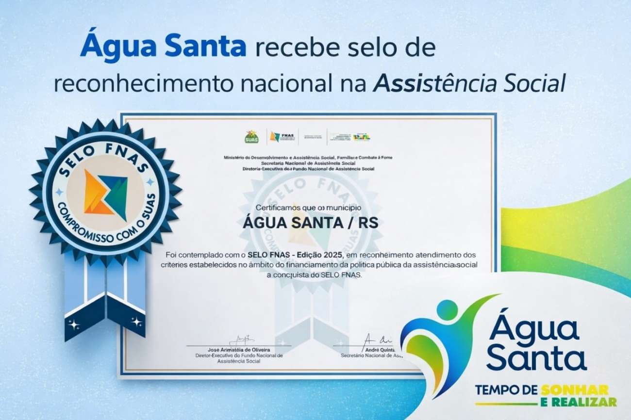 A Prefeitura de Água Santa recebeu o Selo FNAS – edição 2025, certificação concedida a municípios que se destacam na gestão de recursos federais destinados à assistência social. O reconhecimento foi divulgado na manhã desta terça-feira (07), por meio dos canais oficiais do Governo na Internet.