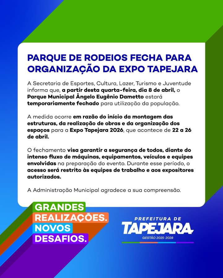 O Parque Municipal Ângelo Eugênio Dametto, em Tapejara, estará temporariamente fechado ao público a partir desta quarta-feira, 8 de abril. A medida ocorre em razão dos preparativos para a realização da Expo Tapejara 2026.