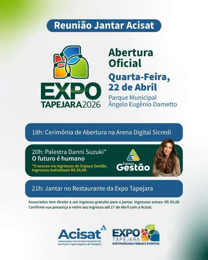 A Associação Comercial, Industrial, de Serviços e Agronegócios de Tapejara (Acisat) promove, no dia 22 de abril, mais uma edição da tradicional reunião jantar, desta vez em um momento especial: integrada à programação de abertura da Expo Tapejara 2026.