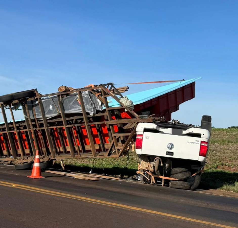 Relatos iniciais apontam que o vento pode ter deslocado a carga, provocando instabilidade no reboque, que tombou e arrastou a caminhonete. Apesar do impacto, foram registrados apenas danos materiais.