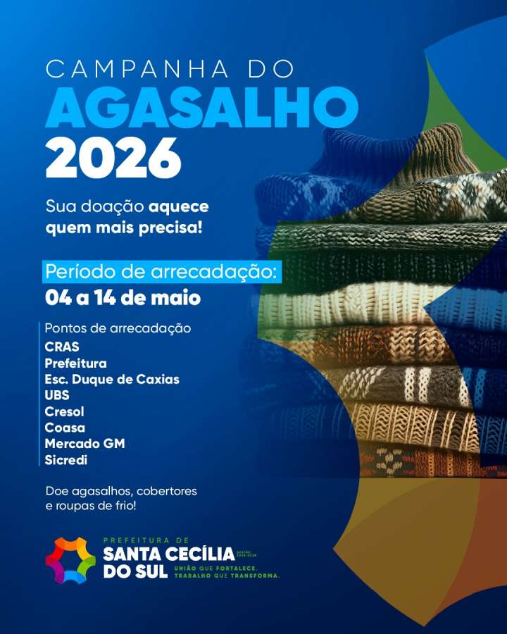 A Prefeitura de Santa Cecília do Sul, por meio da Defesa Civil Municipal e da Secretaria de Desenvolvimento Social, promove de 4 a 14 de maio a Campanha do Agasalho 2026.