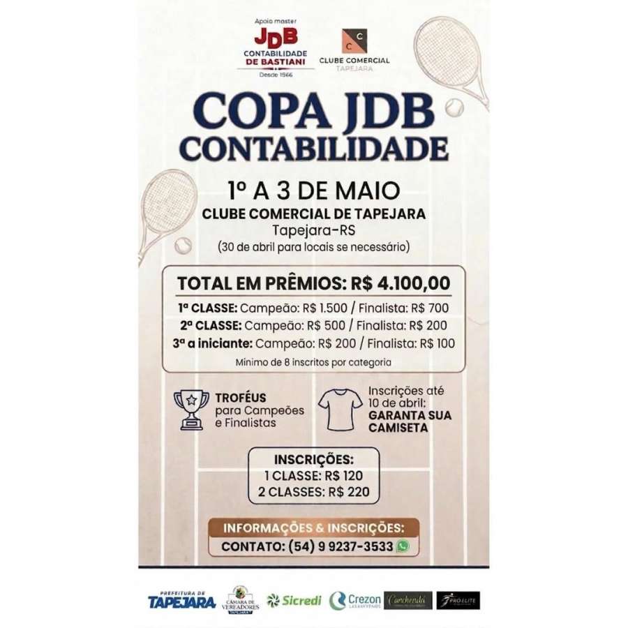 A Copa JDB Contabilidade de Tênis será realizada entre os dias 1º e 3 de maio, no Clube Comercial de Tapejara (RS), reunindo cerca de 100 atletas de 10 cidades da região. O torneio contará com disputas em três classes, incluindo uma categoria para iniciantes, e busca ampliar a participação de jogadores locais e visitantes.