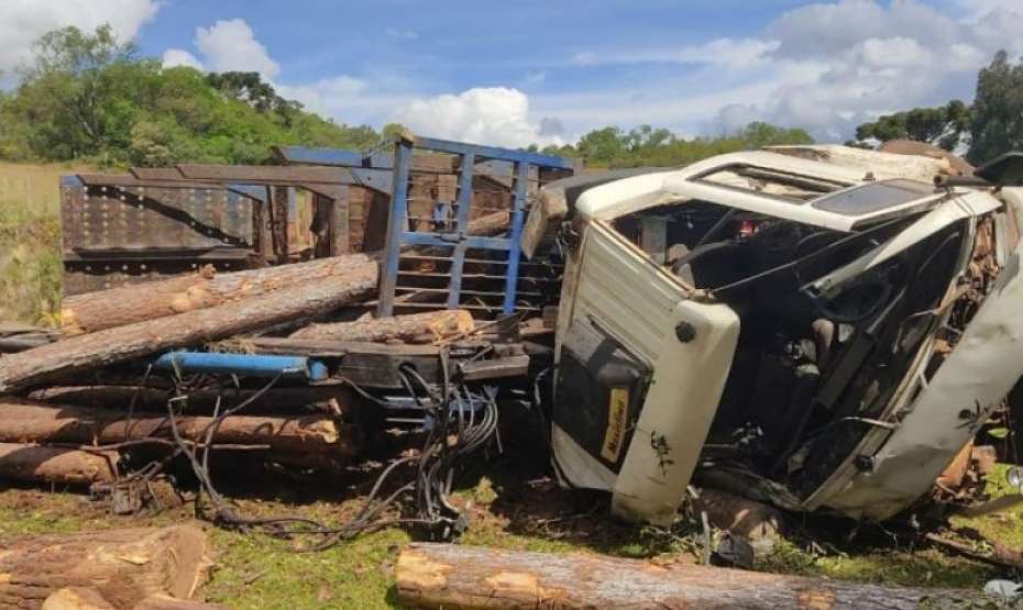 Caminhão de toras tomba na localidade do Rincão Comprido